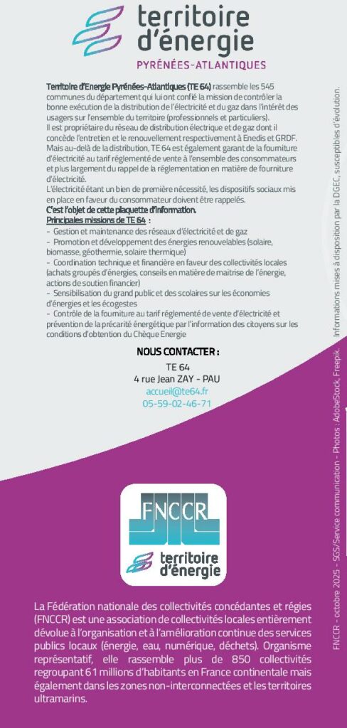 Le Territoire d’Énergie Pyrénées-Atlantiques (TE 64) regroupe les 545 communes du département et veille à la bonne distribution de l’électricité et du gaz dans l’intérêt des usagers.