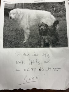 La commune informe les habitants que des chiens ont été signalés perdus sur le secteur. Si vous les apercevez ou si vous disposez d’informations permettant de les retrouver, merci de contacter le numéro ci-dessous. . 06-87-63-19-85 ET 06-32-12-35-13 – à compléter: le Patou s’appelle Patou et le petit labri s’appelle Marquise Merci pour votre vigilance et votre …