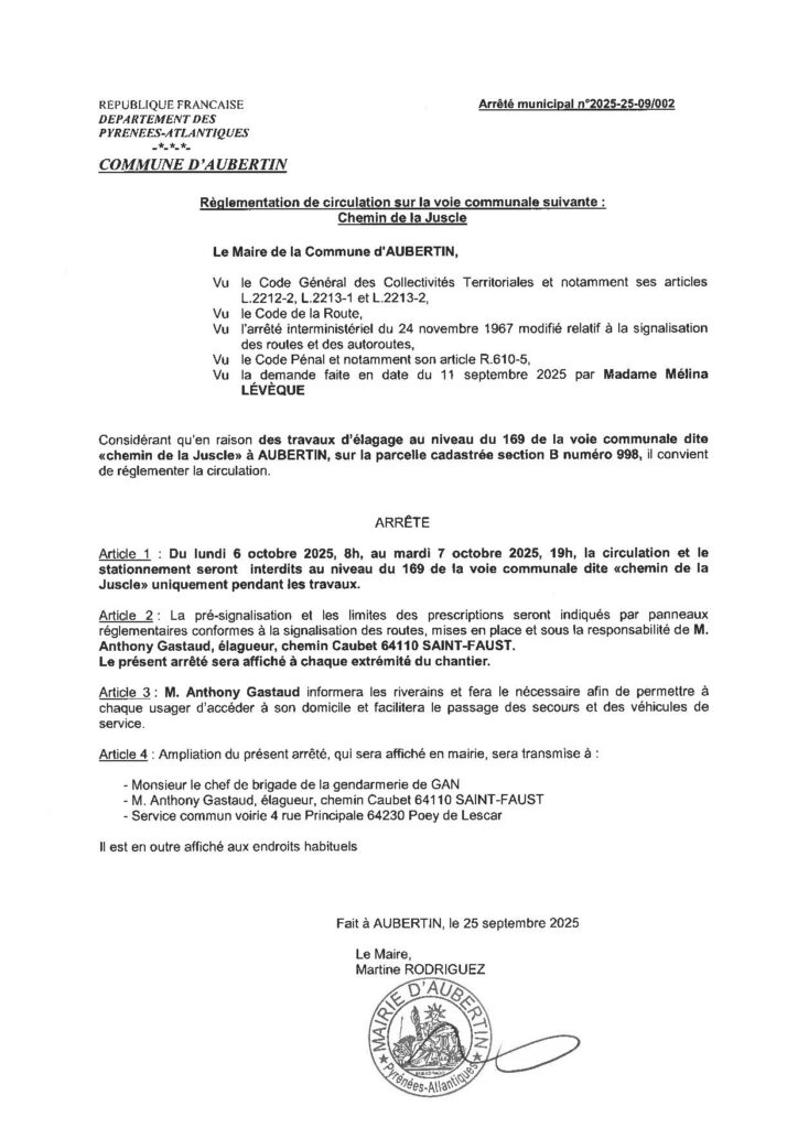 Dans le cadre de travaux d’élagage, le stationnement sera interdit :