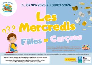 Veuillez trouver ci-joint le programme des animations des mercredis pour les mois de janvier et février. Au cours de cette période, les enfants aborderont notamment la thématique de l’égalité entre les filles et les garçons, à travers des activités ludiques et pédagogiques adaptées à leur âge. Les vacances d’hiver auront pour thème « Objectif Lune …