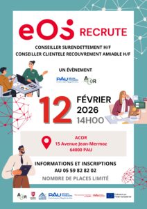 La Communauté d’Agglomération Pau Béarn Pyrénées, en partenariat avec A.CO.R, organise une demi-journée de recrutement avec l’entreprise EOS pour les postes suivants : Conseiller Surendettement H/F Conseiller Clientèle Recouvrement Amiable H/F Date : 12 février 2026 Horaire : 14h00 Lieu : Locaux d’A.CO.R 15 avenue Jean Mermoz 64000 Pau Attention : Le nombre de places …